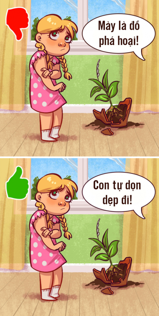 Điều này xảy ra khi cha mẹ không kiềm chế được cảm xúc và buông những lời nói trong vô thức. Theo các nhà tâm lý học, bạn chỉ nên dùng từ ngữ trung lập.