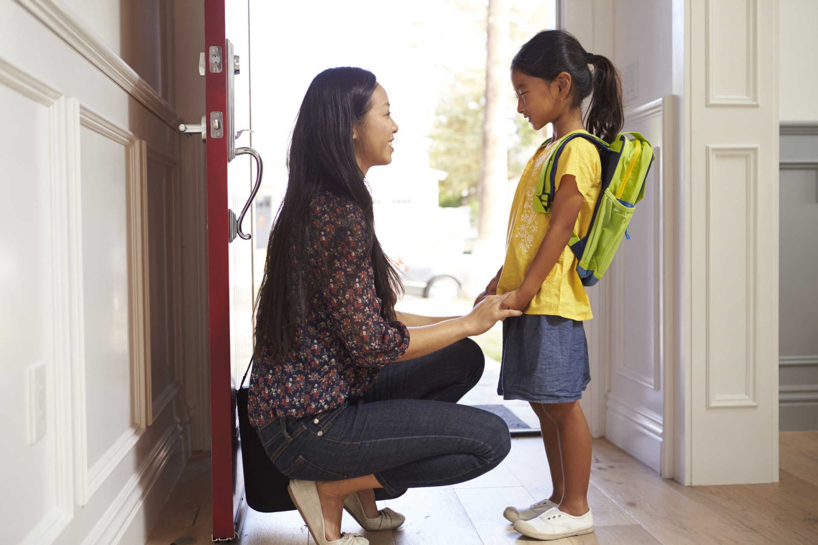 - Khi ở nhà: Khi ở nhà một mình và có người gõ cửa, bé không nên mở cửa ngay lập tức mà nên nói: “Mẹ cháu đi vắng rồi ạ”. Nếu người khách đấy mang một kiện hàng, bé có thể yêu cầu họ đặt kiện hàng xuống và có thể đề nghị họ quay lại lần sau. Nếu có điện thoại bàn, bạn có thể dặn bé khi nào thì nên trả lời điện thoại. Bé 5 tuổi thì còn quá nhỏ, nhưng nếu đã 8 tuổi thì con bạn đã đủ lớn để biết cách nói chuyện điện thoại với người lạ rồi đấy. Nếu khi vắng nhà mà muốn gọi điện thoại cho bé thường xuyên, bạn có thể sử dụng mật khẩu để bé nhận ra bố mẹ.