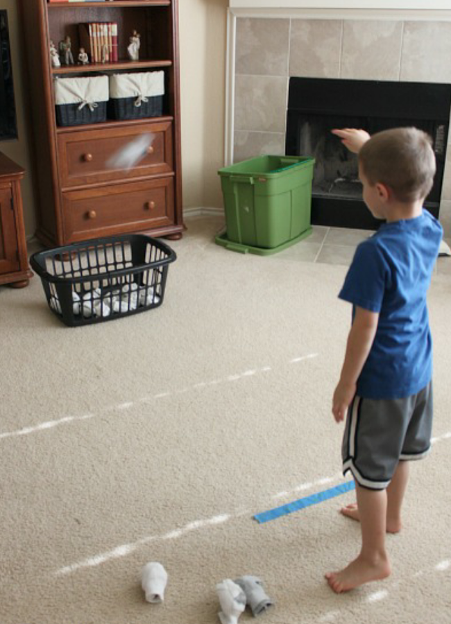 Giống như chơi bóng rổ, trò chơi ném tất này cũng đếm xem con bạn có thể ném được bao nhiêu chiếc tất vào trong rổ trong khoảng thời gian quy định.