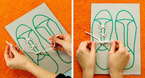 Dạy một đứa trẻ cách tự buộc dây giày đôi khi không phải nhiệm vụ dễ dàng. Để dạy con làm việc này, bạn có thể vẽ hình chiếc giày lên một tấm bìa cứng và đục những lỗ nhỏ mô phỏng đôi giày thật để trẻ có thể tập luồn và buộc dây giày. Cách làm này giúp bạn không phải lo lắng xem con có đang thực hành với một đôi giày bẩn không, đồng thời rèn luyện cho con sự kiên trì và độc lập.