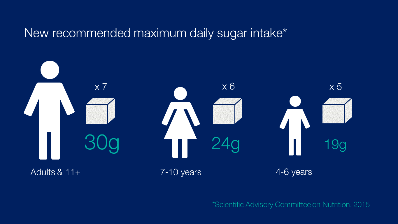 Theo Tổ chức Y tế cộng đồng của Anh Quốc (Public Health England - PHE), mức khuyến nghị lượng đường tối đa cho trẻ em phụ thuộc vào độ tuổi của chúng. Ví dụ: