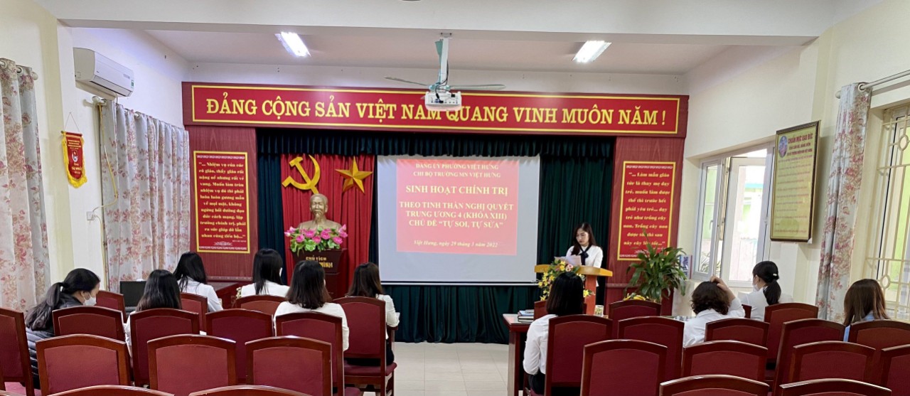 Vào hồi 14 giờ 30 chiều ngày 29/3/2022, tại phòng họp của nhà trường, chi bộ trường MN Việt Hưng đã tổ chức Hội nghị sinh hoạt chính trị trong Đảng theo tinh thần Nghị quyết Trung ương 4 (khóa XIII) với chủ đề "Tự soi, tự sửa". Hội nghị sinh hoạt được diễn ra nghiêm túc dưới sự chủ trì của đồng chí Đặng Thị Thanh Xuân-Bí thư chi bộ-Hiệu trưởng nhà trường và 100% các đ/c đảng viên tham dự.