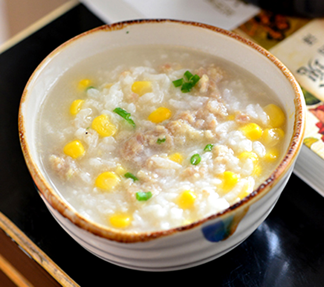 Mẹ có thể thêm món cháo thịt băm ngô ngọt hấp dẫn vào thực đơn bữa sáng của bé. Ảnh Internet