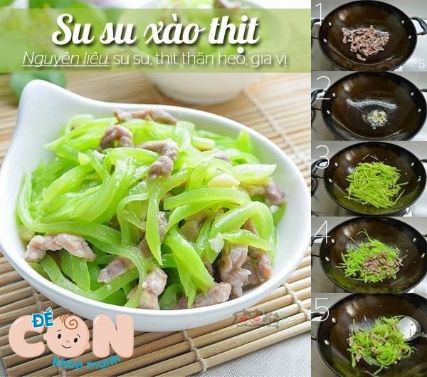 - Phi thơm tỏi, cho su su vào xào ở lửa to. Nêm nếm gia vị cho vừa miệng. Khi su su gần chín, mẹ đổ thịt thăn vào đảo cùng rồi tắt bếp.