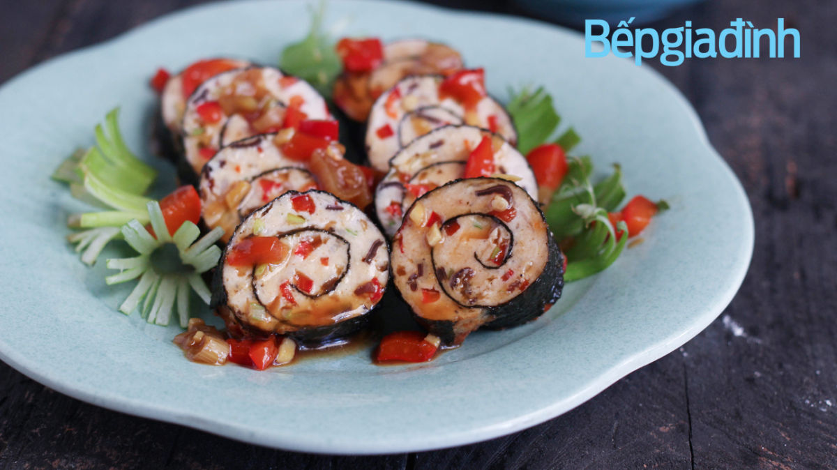 Chả cá trộn đậu hũ, rau củ, nhồi bên trong lá rong biển khi chiên vàng, thơm hấp dẫn, ăn kèm sốt chua ngọt càng tuyệt