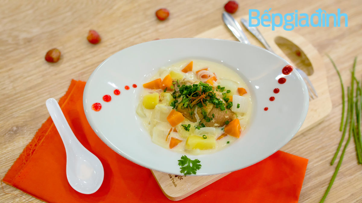 - Cuối cùng múc gà nấu sữa tươi và rau củ ra đĩa sâu lòng, trang trí hành lá, ngò rí, dùng nóng.