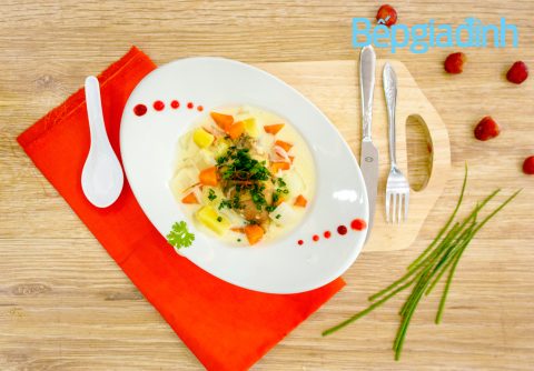 - Cuối cùng múc gà nấu sữa tươi và rau củ ra đĩa sâu lòng, trang trí hành lá, ngò rí, dùng nóng.