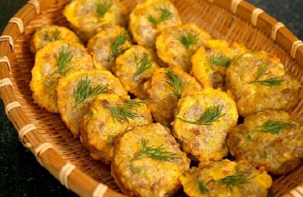 + Chiên hỗn hợp thành từng miếng chả nhỏ