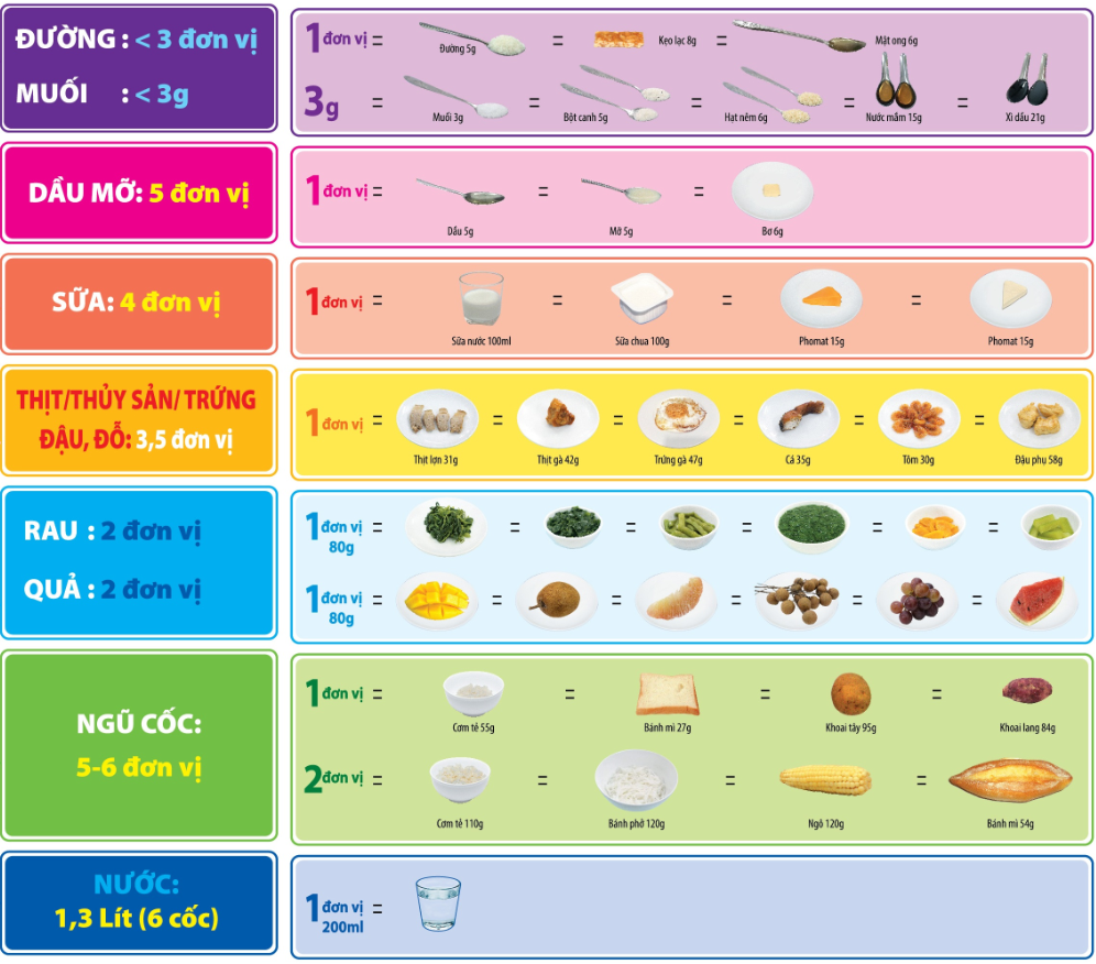 - Ngũ cốc, khoai củ và các sản phẩm chế biến: ăn trung bình 5-6 đơn vị ăn ngũ cốc, khoai củ và sản phẩm chế biến trong một ngày. Đơn vị ăn thực phẩm tham khảo trong bài Hướng dẫn sử dụng các đơn vị ăn của tháp dinh dưỡng để ước lượng thực phẩm. Trong mỗi bữa ăn nên có sự phối hợp giữa ngũ cốc và khoai củ.