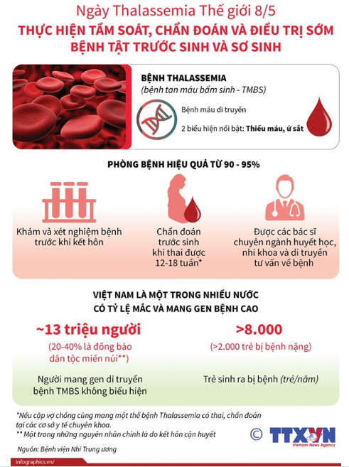 Thalassemia hay còn gọi là bệnh tan máu bẩm sinh là do tan máu di truyền. Ngày Thalassemia thế giới được tổ chức vào ngày 8/5 hàng năm là một cơ hội để giúp những người mắc bệnh này sống khỏe mạnh hơn, lâu hơn và hiệu quả hơn thông qua việc chia sẻ kiến thức, trao đổi thông tin, tổ chức các hoạt động nâng cao nhận thức có mục tiêu và giáo dục chất lượng về bệnh Thalassemia.