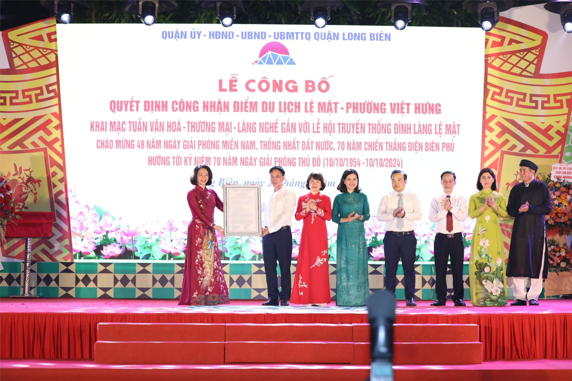 Tại buổi lễ, Đồng chí Đặng Hương Giang - Giám đốc Sở Du lịch Hà Nội đã công bố Quyết định của UBND Thành phố về việc công nhận điểm du lịch Lệ Mật, thuộc phường Việt Hưng, quận Long Biên; Phó Chủ tịch UBND Thành phố Vũ Thu Hà trao quyết định và tặng hoa cho cán bộ, Nhân dân phường Việt Hưng; các đại biểu nhấn nút khai mạc Tuần lễ Văn hóa - Thương mại - Làng nghề quận Long Biên năm 2024.