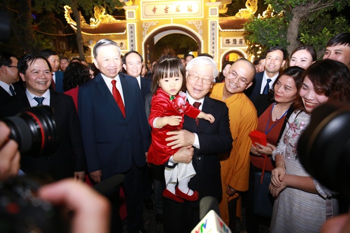 Tổng Bí thư Nguyễn Phú Trọng chúc Tết Nhân dân Thủ đô Hà Nội tại chùa Trấn Quốc, ngày 4/2/2019. Ảnh: Phạm Hùng