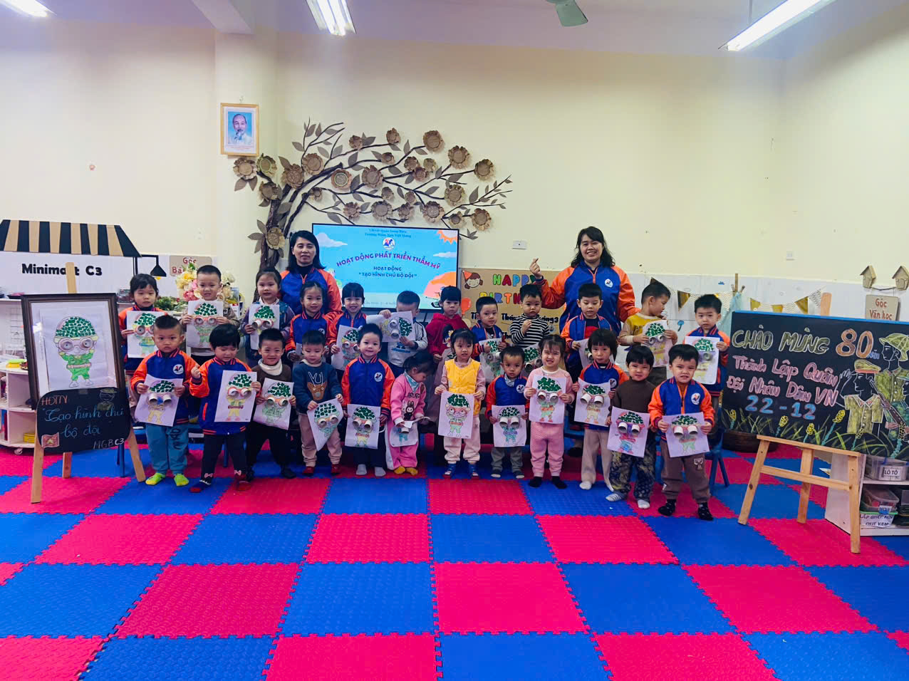 Hòa chung với không khí tưng bừng phấn khởi của cả nước hướng về kỷ niệm ngày thành lập Quân đội nhân dân Việt Nam, cô và trò lớp MGB - C3 trong giờ hoạt động tạo hình “Tạo hình chú bộ đội” là một trong những hoạt động ý nghĩa đối với trẻ hướng tới lễ kỷ niệm ngày thành lập Quân đội nhân dân Việt Nam (22/12/1944 - 22/12/2024). Qua hoạt động này trẻ hiểu được ý nghĩa của ngày 22/12, tạo cơ hội để trẻ bày tỏ niềm tự hào, sự quý trọng dành cho các chú bộ đội và thể hiện ý thức, trách nhiệm của thế hệ trẻ trong công cuộc xây dựng và bảo vệ Tổ quốc hiện nay. Ngoài ra trẻ còn được rèn luyện sự khéo léo của đôi bàn tay, khả năng sáng tạo hình thành những chú bộ đội với màu áo xanh thân thương từ nguyên liệu tự nhiên gửi đến các chú nhân ngày 22/12.
