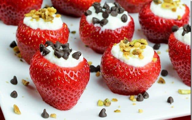 Cho khoảng 250g phô mai, 30g đường nhuyễn và 1/2 muỗng vani vào những trái dâu tây đã làm rỗng ruột. Xay nhuyễn một ít dâu tây và đổ lên trên. Bạn có thể rắc thêm một ít chocolate chip để trang trí đẹp mắt.