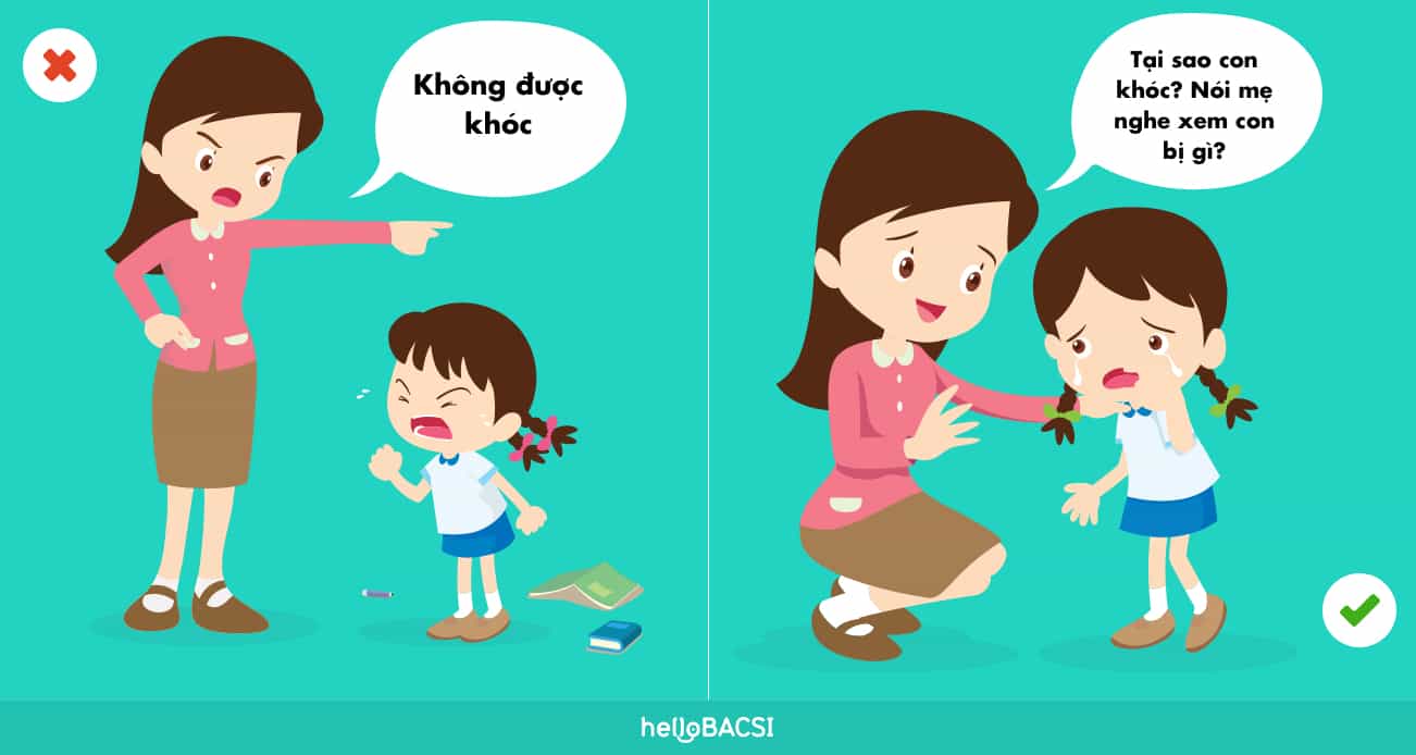 Không nên: Khi không thể kiềm chế cảm xúc, bạn sẽ la rầy bé như thế. Trẻ sẽ suy nghĩ: “Càng khóc mình sẽ càng bị la thôi”. Dần dần trẻ sẽ thu mình lại, giấu cảm xúc và không chia sẻ với ba mẹ cũng như bạn bè điều gì cả.