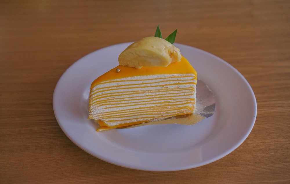 Khác với bánh crepe sầu riêng truyền thống có hình chữ nhật, bánh crepe sầu riêng ngàn lớp có hình tròn với nhiều lớp vỏ bánh xen kẽ lớp nhân bánh trông rất bắt mắt. Khi bé ăn, bạn có thể cắt bánh thành từng miếng nhỏ hình tam giác.