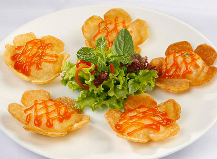 - Xếp bánh ra đĩa dùng chung với xà lách trộn dầu giấm. Chấm thêm nước xốt tùy khẩu vị.