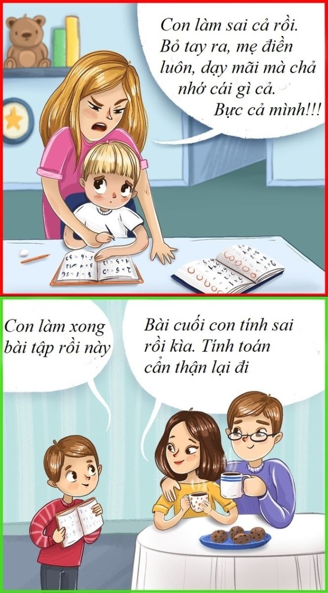 Ba mẹ chỉ nên hỗ trợ chứ đừng vì thấy trẻ khóc lóc, khó bảo hay chậm hiểu mà làm giúp trẻ bài tập về nhà. Trẻ em chỉ tiến bộ khi tự hoàn thành các bài tập mà thầy cô đã giao, phụ huynh nên là người hướng dẫn chỉ ra chỗ đúng sai hơn là “sách tham khảo” cho bé.