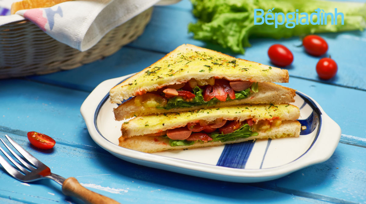 - Cho bánh mì sandwich vào lò nướng trong 5 phút ở 180 độ C cho se mặt. Hoặc cho lên chảo nướng áp chảo cho mặt bánh hơi se lại là được.