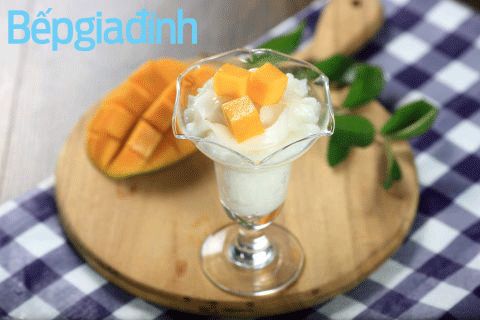- Cho pudding gạo sữa dừa vào ly, thêm dừa non lên, trang trí thêm xoài cắt hạt lựu, dùng lạnh.