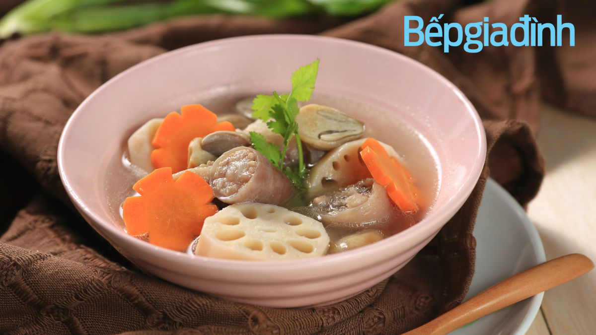 - Khi đuôi heo đã mềm, cho cà rốt, củ sen vào nấu trong 10 phút, cho thêm nấm rơm vào, nêm 1/3 muỗng cà phê muối, 1 muỗng canh nước mắm, ít đường, tiêu vừa ăn.