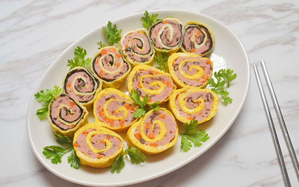 - Bước 3: Trải lòng đỏ ra mâm rồi phết lớp hỗn hợp giò vừa trộn sau đó cho lòng trắng trứng lên rồi cho tiếp lớp giò.