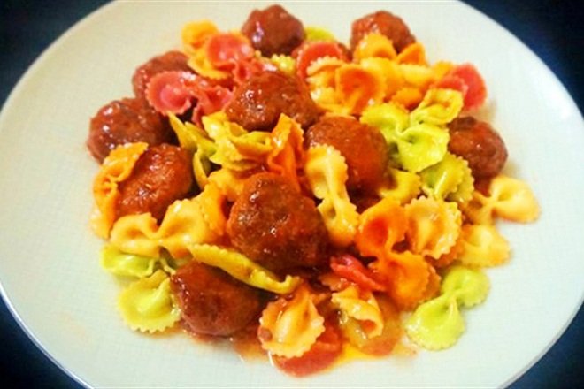 - Nui sau khi ráo nước, chuyển qua dĩa, xếp thịt bò viên lên. Sau cùng, rưới nước sốt tương cà lên trên là hoàn tất cho bé bữa điểm tâm bắt mắt và vô cùng ngon miệng.