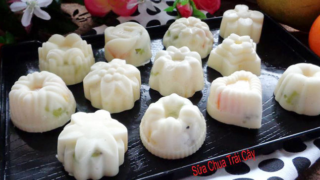 - Cho khuôn sữa chua trái cây vào ngăn đá tủ lạnh khoảng 4 tiếng sữa chua vừa đông cứng.