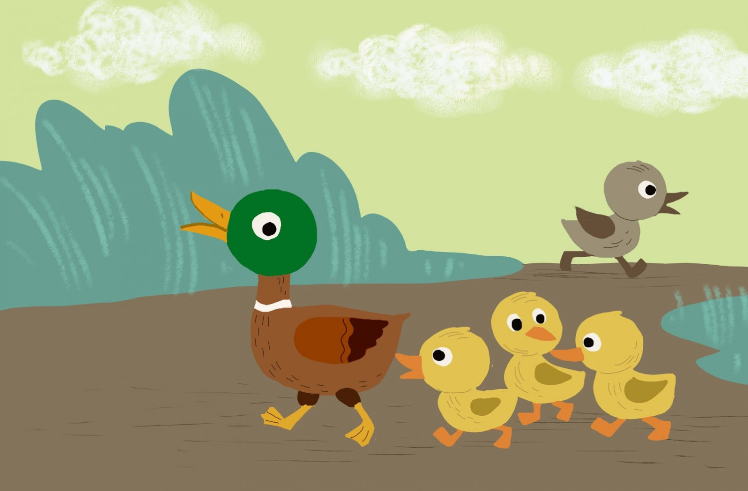 Lúc này, vịt xám bắt đầu hoảng sợ, bèn nhảy lên bờ gọi mẹ ầm ĩ. Gần đấy có một con cáo đang ngủ, nghe tiếng vịt xám kêu, liền tỉnh dậy chạy nhanh ra phía bờ ao. Khi cáo vừa đến nơi thì may mắn thay cũng là lúc vịt mẹ tìm thấy vịt xám. Trông thấy cáo đang đến gần, vịt mẹ bèn dẫn vịt xám nhảy ùm xuống ao. Vịt xám thoát chết trong gang tấc. Cũng từ đó mà vịt xám không bao giờ dám làm sai lời mẹ dặn.