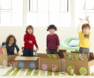 Cách chơi: Bạn cần vài cái vỏ hộp rỗng đủ lớn để bé ngồi vào trong. Chuẩn bị các phụ liệu để cắt dán, và dạy một bé cách để biến cái hộp của mình thành một toa tàu. Sau khi bé cố gắng trang trí chiếc hộp với bánh xe, cửa sổ và bất cứ thứ gì bé nghĩ ra, bạn hãy giúp bé nối từng toa với nhau.