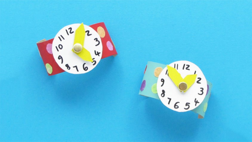- Bước 4: Cuối cùng dàn 2 chiếc dây ở mặt sau của mặt đồng hồ rồi dùng keo cố định ở 2 đầu quai, nhưng mẹ lưu ý hãy dán lỏng để khi đeo không bị cứa vào tay của bé.