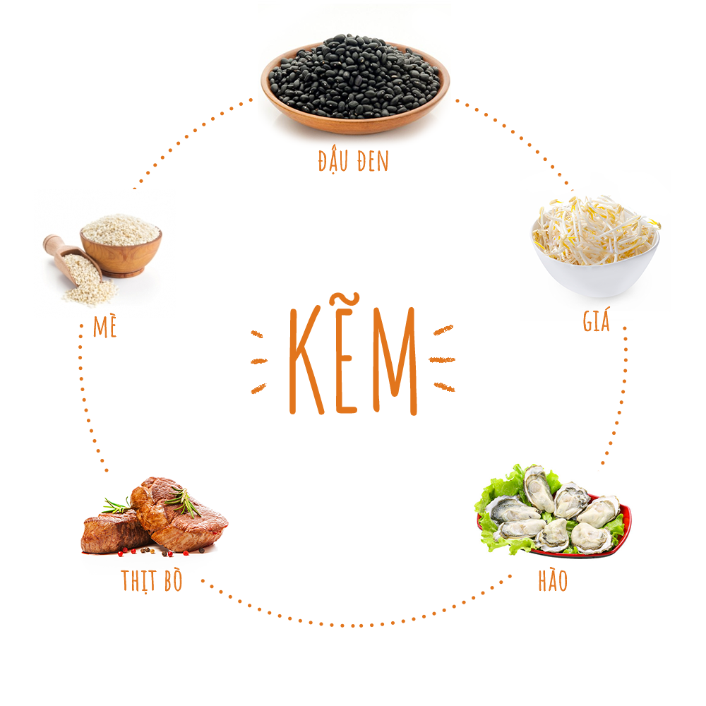Các thực phẩm giàu kẽm là đậu đen, giá, hàu, hải sản, thịt bò, mè…