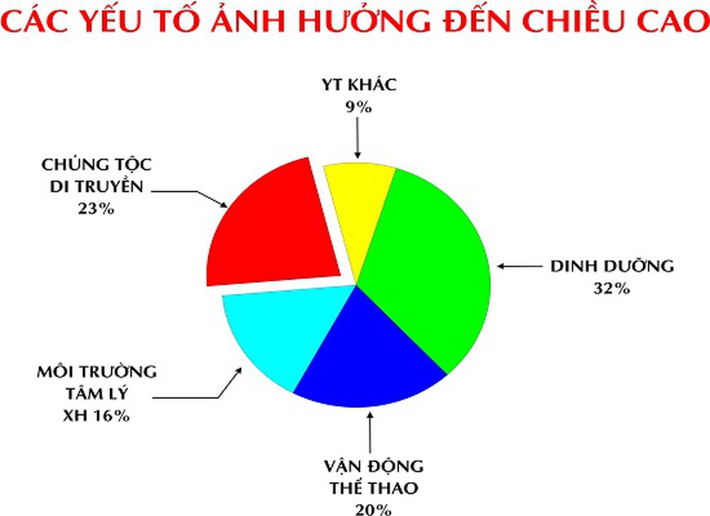 Theo một số nghiên cứu trên thế giới, chiều cao của trẻ thường chỉ chịu tác động bởi 5 yếu tố: Di truyền chiếm khoảng 23 %, Yếu tố dinh dưỡng chiếm 32 %, Môi trường sống 15 %, Các yếu tố khác chiếm 10 % ( bệnh mãn tính, chăm sóc của ba mẹ, thói quen sống…), Vận động tích cực và quá trình tập luyện thể thao chiếm 20 %.