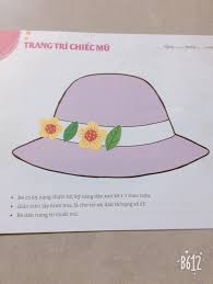 - Cô vừa xé vừa giải thích cách xé .Cô chọn giấy màu cô thích . Cô dùng 2 ngón tay của bàn tay ,xé tờ giấy màu thành những bông hoa và lá, rồi cô phết hồ và dán lên trang trí cái mũ .Bức tranh trang trí cái mũ của cô đã hoàn thành xong rồi