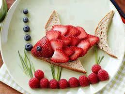 + Còn đây là một bức tranh về đại dương với chú cá làm từ cà rốt, sao biển làm từ thanh long, rùa biển làm từ kiwi và chú cua làm từ miếng dâu tây đấy.