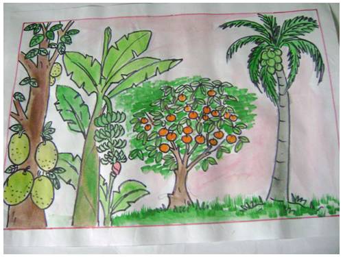 - Nếu vẽ vườn cam thì cây cam thân to dùng các nét xiên, tán lá cũng to vẽ bằng các nét cong và quả tròn nhé, Còn cây đu đủ thân thẳng các con vẽ bằng các nét thẳng, quả dùng các nét cong nhé…