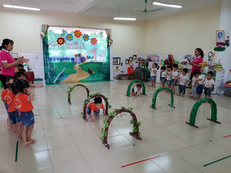 Hôm nay cô sẽ cho các con thực hiện vận động “Bò thấp chui qua cổng”