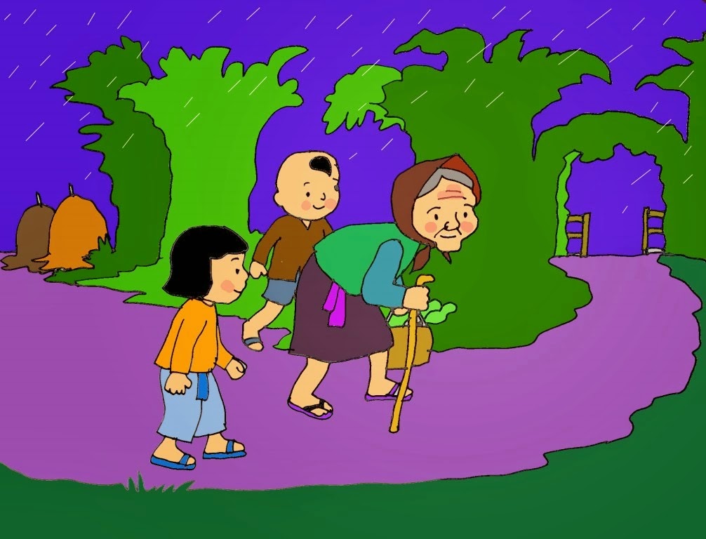 Các con ạ: Mấy hôm trước Bà còng đi chợ và gặp trời mưa đấy, có hai bạn nhỏ đã gặp Bà còng và đã đưa bà còng về nhà đấy. Các con có biết đó là những bạn nào không nhỉ?