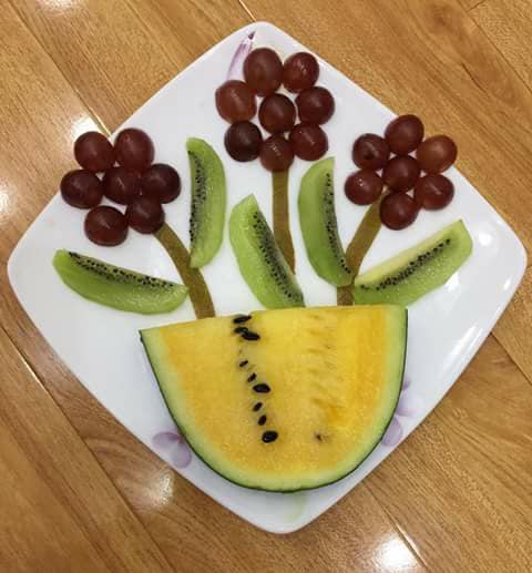 Vậy hôm nay cô sẽ cho lớp mình làm những bức tranh từ rau và quả nhé.