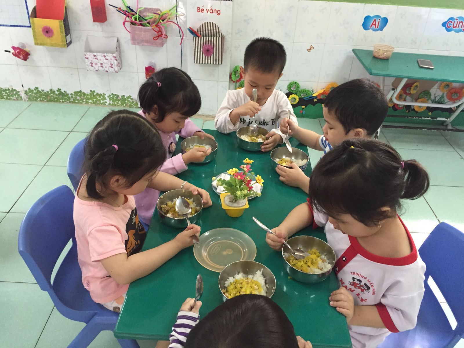 - Số cơm canh còn lại cô chia đều vào bát to về các nhóm.
