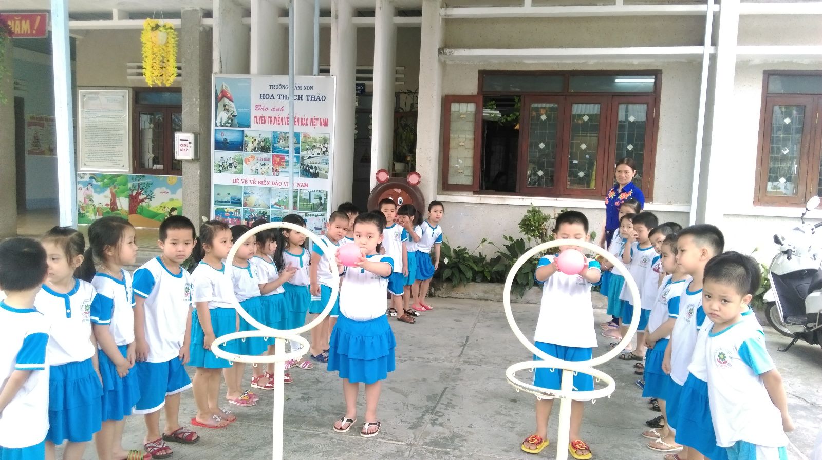 Qua giờ học cô giúp trẻ làm hiện tốt bài tập ném trúng đích thẳng đứng