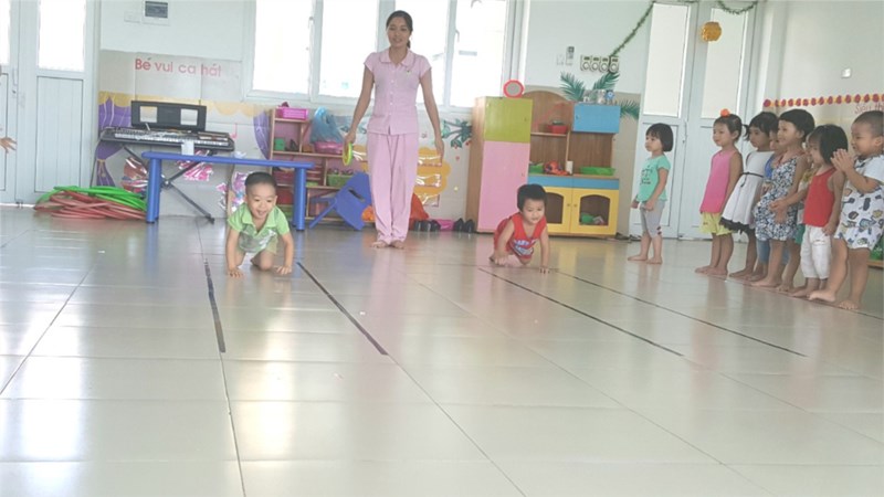 - Trẻ biết bòtheo hướng thẳng, mắt nhìn thẳng về phía trước, bàn tay và cẳng chân sát sàn, chân tay phối hợp nhịp nhàng, không chạm người vào vạch.