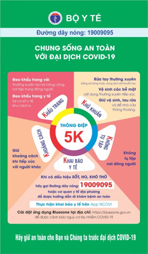 Để chủ động phòng, chống dịch COVID-19 trong trạng thái “bình thường mới”, Bộ Y tế mong muốn và kêu gọi mỗi người dân Việt Nam cùng nhau thực hiện Chung sống an toàn với đại dịch COVID-19. Bộ Y tế gửi đến Bạn “Thông điệp 5K: Khẩu trang – Khử khuẩn – Khoảng cách – Không tụ tập – Khai báo y tế” với các nội dung chính sau đây:
