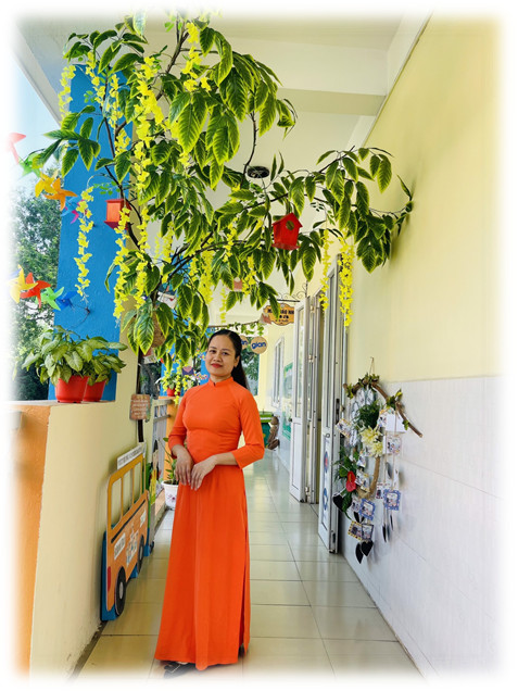 Cô Hồng bên cạnh "Cây biết ơn” trước cửa lớp MGN B3