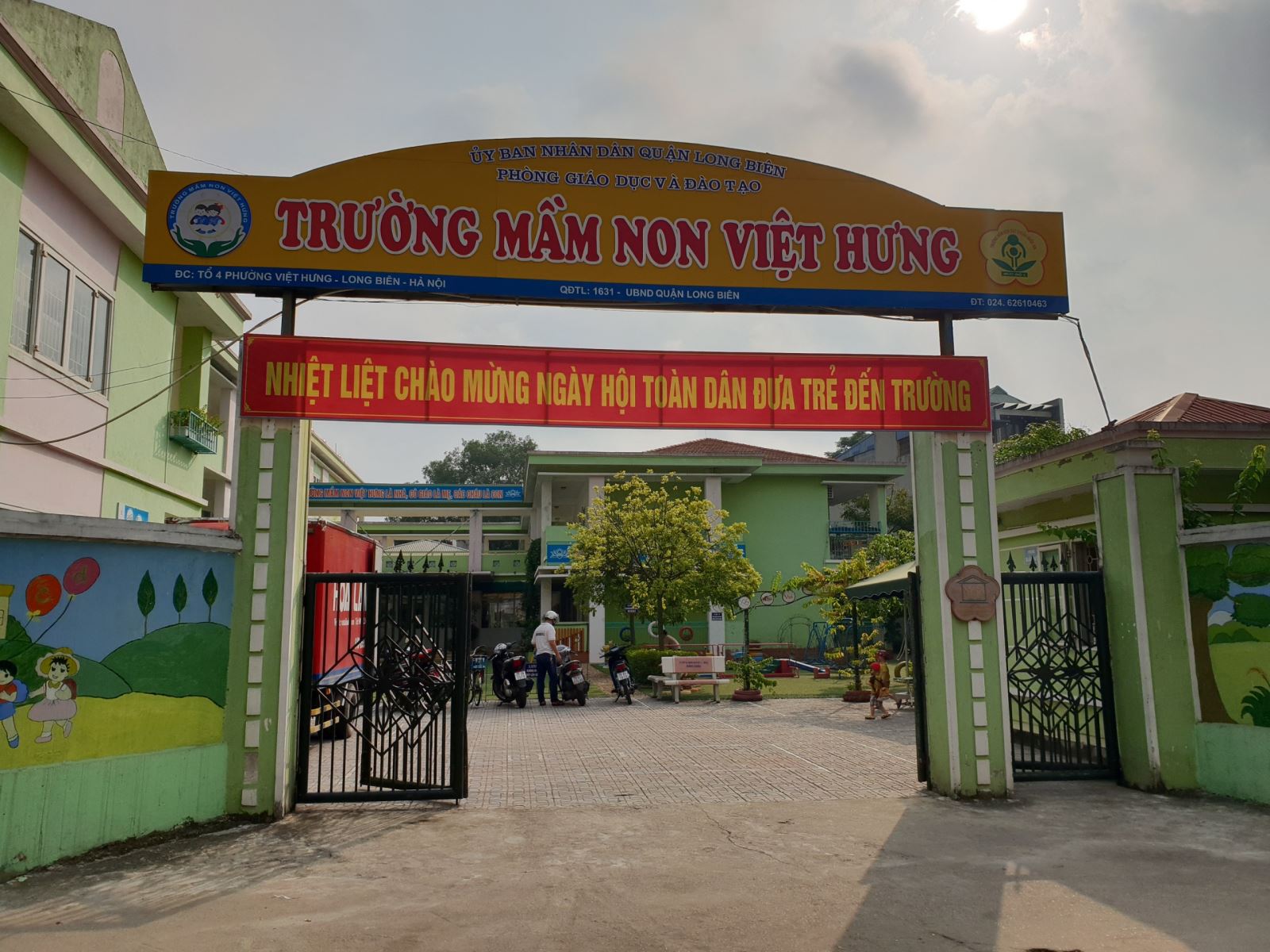 Để đảm bảo điều kiện cho các bạn nhỏ đi học trở lại sau thời gian nghỉ hè và nghỉ học phòng dịch bệnh Covid-19, Trường MN Việt Hưng đã tiến hành phun khử khuẩn môi trường tại trường học theo hướng dẫn của Bộ Y tế kết hợp tổng vệ sinh môi trường, lớp học: lau nền nhà, tường nhà, tay nắm cửa, tay vịn cầu thang, tay vịn lan can, bàn ghế, đồ chơi, dụng cụ học tập, đồ vật trong phòng... Khử khuẩn bằng các chất tẩy rửa thông thường, và dung dịch cloramin B 0,5%.