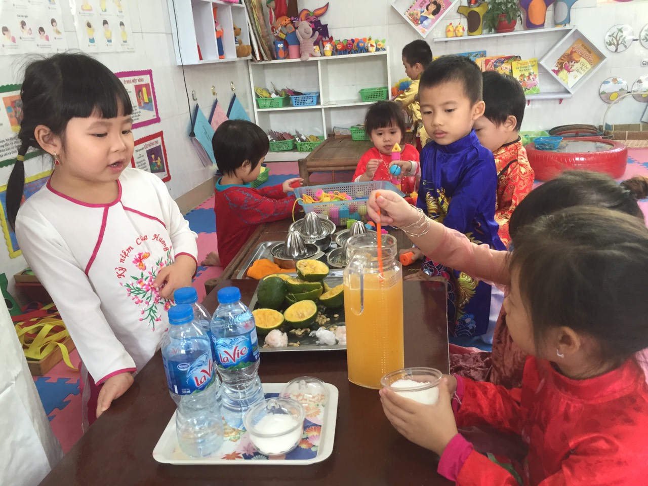 Bố mẹ có biết các bé rất giỏi không, các bé còn biết tự tay vắt những cốc nước cam ngon lành để uống và mời cô, mời bạn thưởng thức nữa đấy,