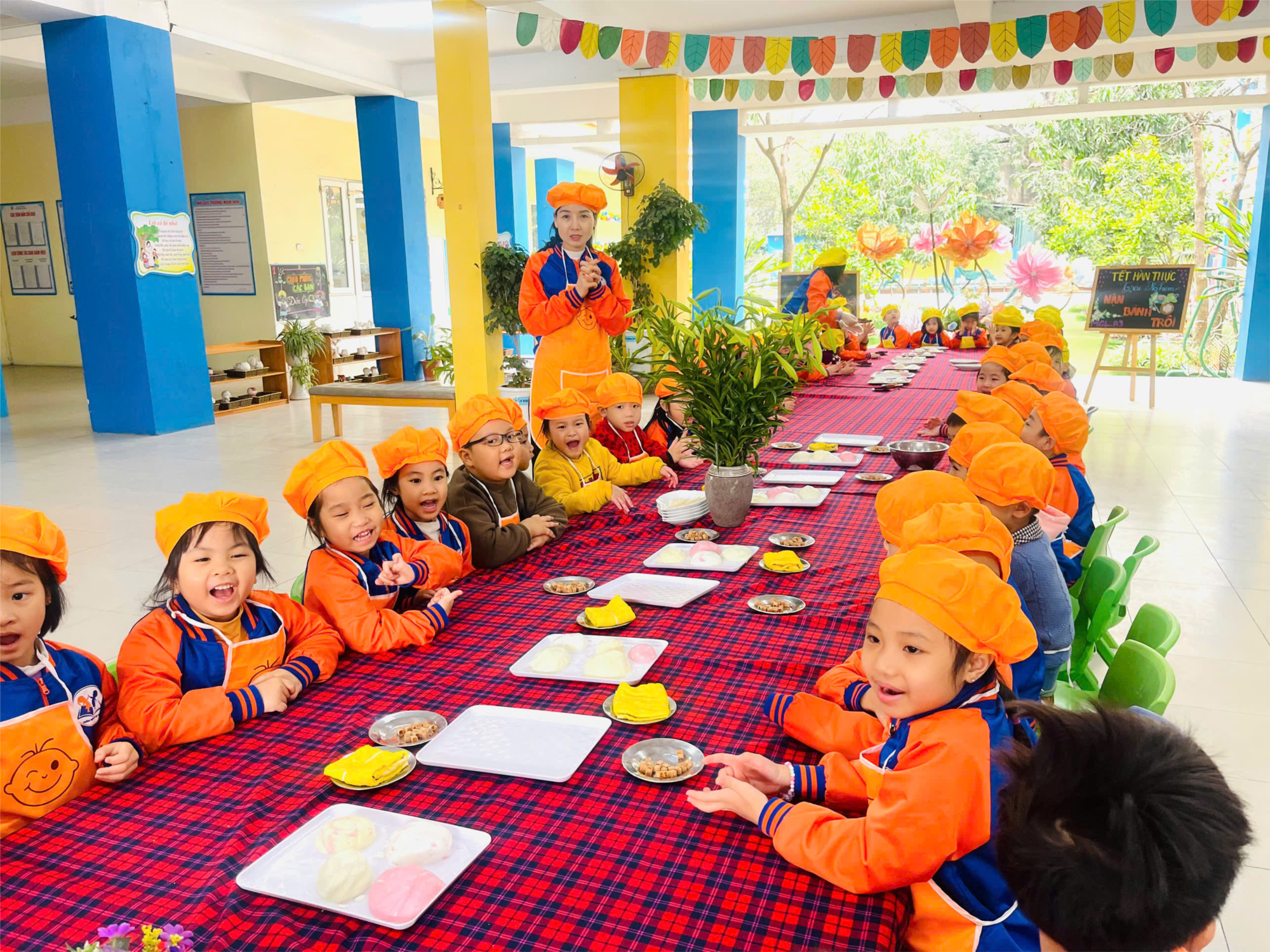 Để đảm bảo vệ sinh an toàn thực phẩm, Ban phụ huynh nhà trường đã chuẩn bị nguyên liệu: bột bánh, nhân đường, vừng... được mua ở siêu thị rõ xuất sứ, nguồn gốc. Ngay từ đầu giờ sáng, các cô chuẩn bị sẵn sàng các nguyên liệu làm bánh như nhào bột, tạo màu hấp dẫn để trẻ nặn bánh trôi.
