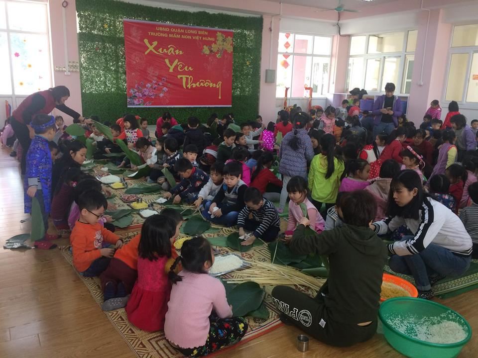 Nhưng với trường mầm non Việt Hưng, các em học sinh cùng các cô giáo và các bậc phụ huynh nhà trường bận rộn với gạo nếp trắng, thịt mỡ với nhân đỗ, lá dong, cùng học cách tự tay gói nhưng chiếc bánh chưng xinh sắn. Các em Học sinh khéo léo, cẩn thận gói những bánh chưng đẹp, vuông vức đầy ý nghĩa để hôm sau các em về tết có món quà ý nghĩa dành tặng bố mẹ và người thân trong gia đình trong những ngày Tết đến, xuân về.
