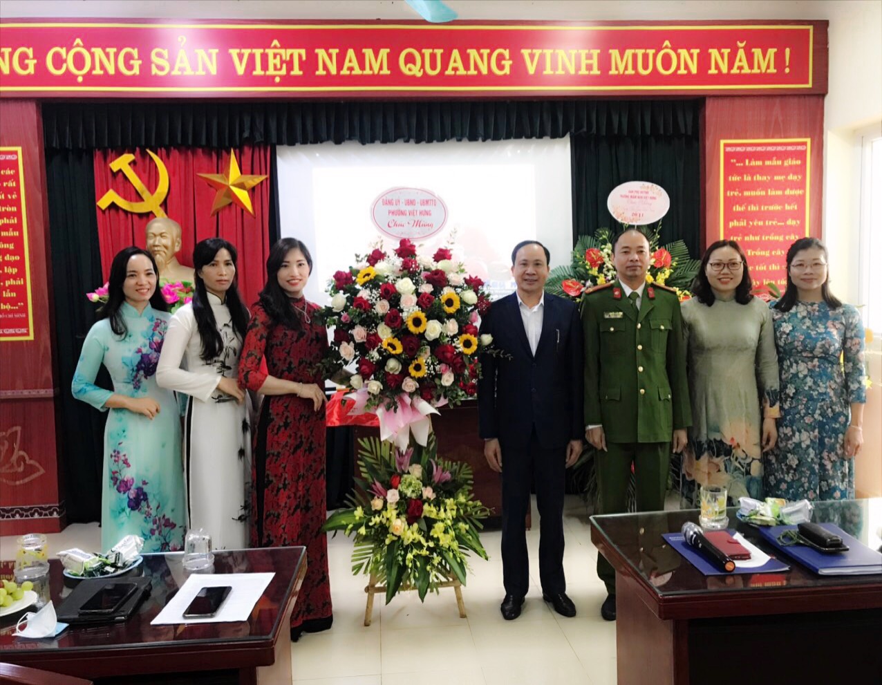 Trong nhiều năm qua, cô và trò Trường Mầm non Việt Hưng đã nhận được sự quan tâm của Đảng uỷ, HĐND, UBND và các ban ngành đoàn thể trong Phường Việt Hưng. Đó là động lực giúp cho các cô giáo ngày càng yêu nghề hơn, tận tâm hơn với sự nghiệp trồng người. Đại diện Phường Việt Hưng đồng chí Đ/c: Âu Mạnh Tùng – Phó bí thư thườn trực Đảng ủy đã lên tặng hoa và chúc mừng các đồng chí CBGVNV nhân ngày nhà giáo Việt Nam.