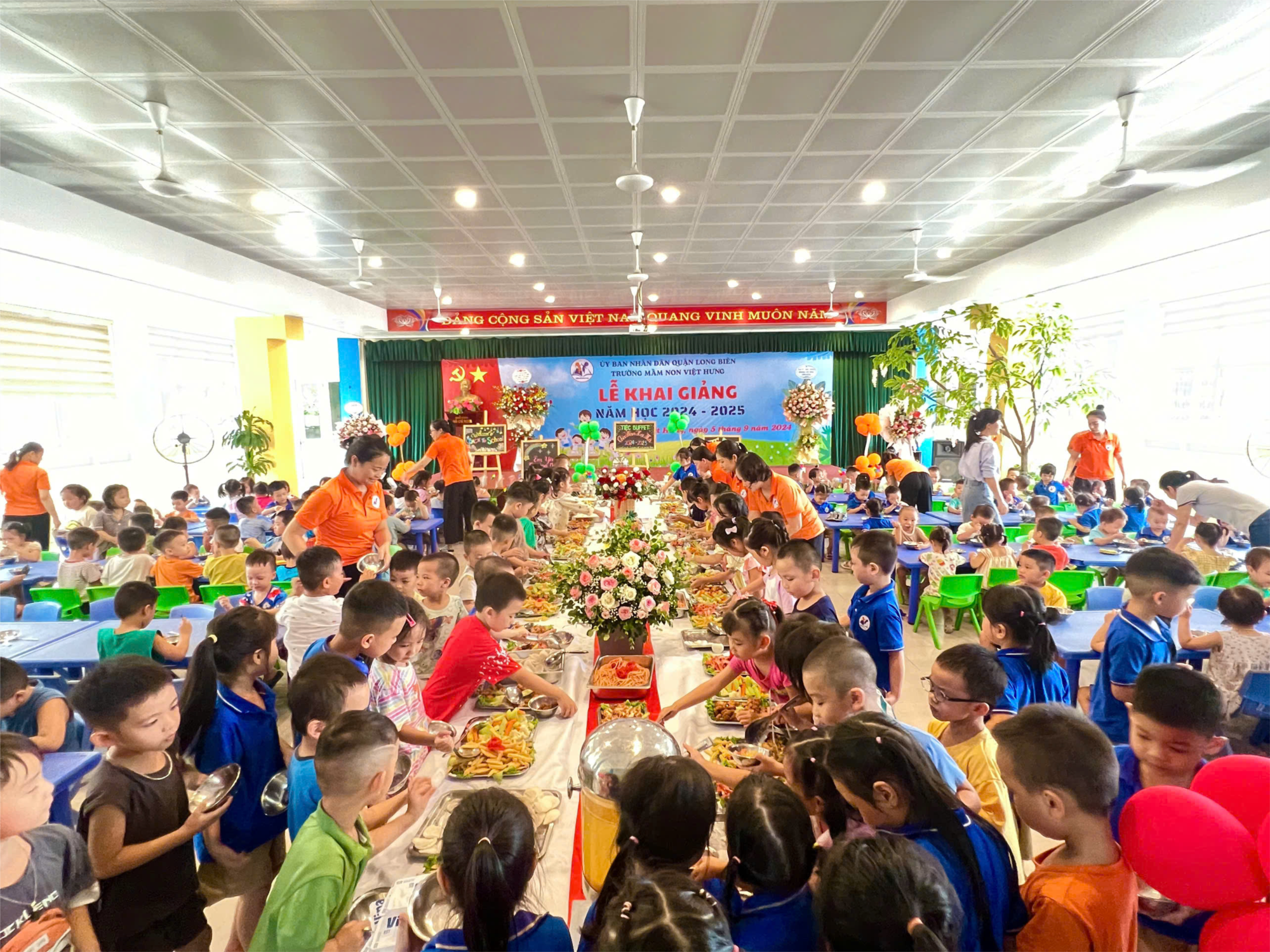 Trong tiết trời thu những cảm xúc khó tả của mùa khai trường, các bé được thưởng thức Tiệc Buffet với những món ăn hấp dẫn được các Cô nhân viên nuôi dưỡng, cô giáo chế biến và bày trí đẹp mắt với thực đơn phong phú và đảm bảo tuyệt đối vệ sinh an toàn thực phẩm.
